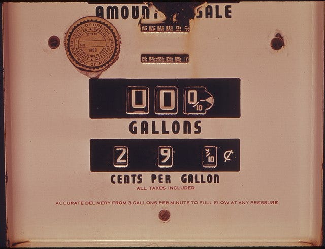 Gas pump, 1974: Public Domain (The U.S. National Archives – David Falconer – Wikimedia Commons)