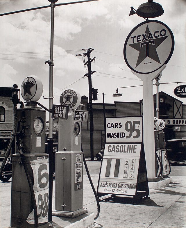Gas station, 1936: Public Domain (Berenice Abbott – Wikimedia Commons)